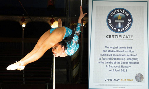 Уран нугараач Эрдэнэбилэгийн Цацрал өнгөрсөн дөрөвдүгээр сарын 9-нд Унгарын Будапешт хотын "Circus Maximus" театрт Marinelli-ийн байрлалд буюу шүдэн дээрээ биеийнхээ бүх жингээр тогтон нугардаг үзүүлбэрийн рекордыг хоёр минут 34 секунд болгон Гиннесийн номонд бичигджээ. Тэрээр 2006 онд Францын нийслэл Парис хотод зохиогдсон өсвөрийн циркчдийн тэмцээнд III байр эзэлж байсан чадварлаг уран нугараач юм.