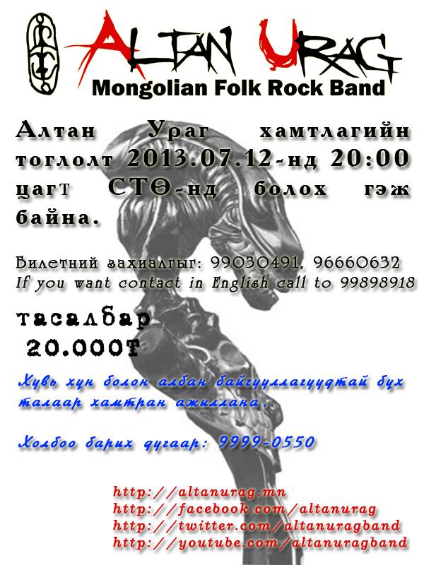 Үндэсний хөгжмийг орчин үеийн хэв маягтай нэгтгэн, уран бүтээл хийдэг “Алтан ураг” хамтлагийнхан үндэсний баяр наадмаар өөрсдийн бие даасан тоглолтыг хийхээр болжээ. Тоглолт долдугаар сарын 12-нд 20.00 цагаас болох аж. Тасалбарын үнэ 20.000 төгрөг байх юм байна.